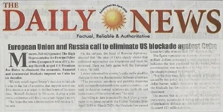 También el Daily News publica este miércoles declaraciones recientes del Alto Representante para la Política Exterior de la Unión Europea (UE), Josep Borrell, quien instó al nuevo presidente estadounidense, Joe Biden, a eliminar el cerco de Washington a la isla caribeña.