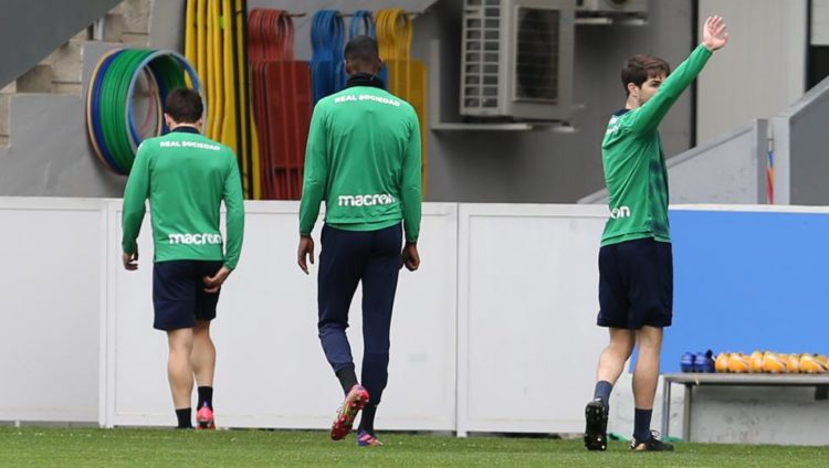 El delantero de la Real Sociedad Mikel Oyarzabal se retiró antes de tiempo del entrenamiento por unas molestias en el muslo.