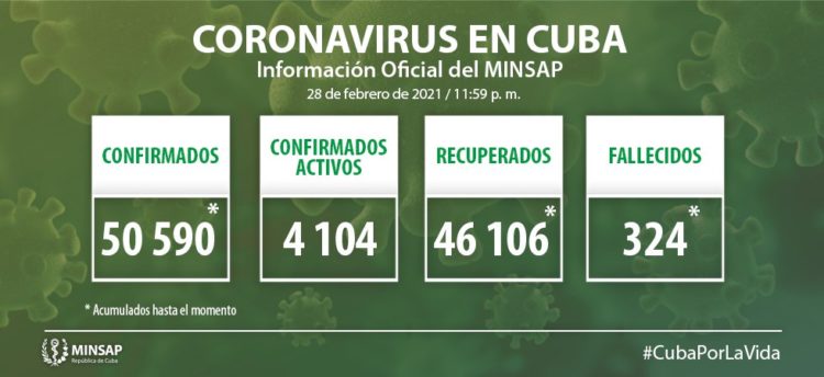 De los 50 mil 590 pacientes diagnosticados con la enfermedad, se mantienen ingresados 4 mil 104, de ellos 4 mil 42 con evolución clínica estable. Se acumulan 324 fallecidos (dos en el día), dos evacuados, 54 retornados a sus países, 864 altas del día, se acumulan 46 mil 106 pacientes recuperados (91,1%). Se atienden en las terapias intensivas 62 pacientes confirmados, 23 críticos y 39 graves.