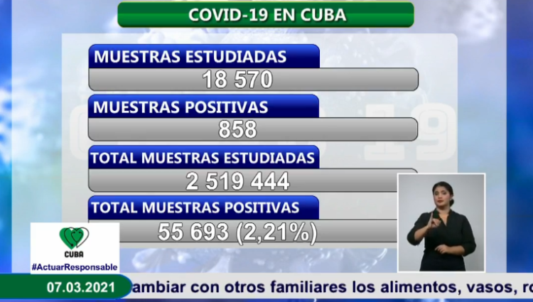 De los 55 mil 693 pacientes diagnosticados con la enfermedad, se mantienen ingresados 4 mil 510, de ellos 4 mil 441 con evolución clínica estable. Se acumulan 348 fallecidos (cuatro en el día), dos evacuados, 54 retornados a sus países, 890 altas del día, se acumulan 50 mil 779 pacientes recuperados (91,1%). Se atienden en las terapias intensivas 69 pacientes confirmados, 28 críticos y 41 graves.