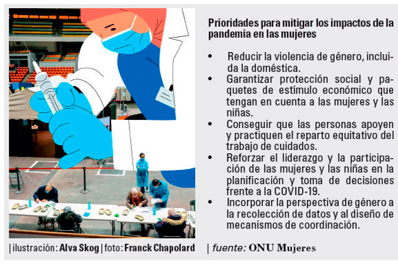 Las mujeres encabezan la batalla global contra la pandemia, pues son mayoría (70 %) entre los trabajadores del sector de la salud y de cuidados. También sostienen la primera línea de científicos y cuidadores. No obstante, ganan un 11 % menos que sus homólogos masculinos y apenas ocupan el 30 % de los puestos de dirección en el sector sanitario mundial. Solo en el 3,5 % de los 87 países estudiados por ONU Mujeres existía paridad de género en el salario de quienes laboraban en la respuesta a la pandemia.