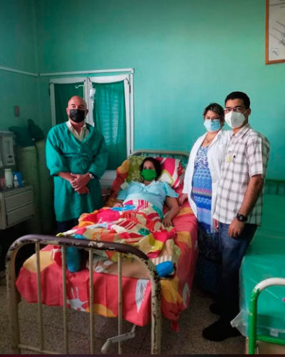 - Ciudadana cubana de 44 años de edad. Municipio Cacocum. Provincia Holguín. Antecedentes Patológicos Personales: Anemia Hemolítica Autoinmune. Se encuentra en Cuidados Intensivos, afebril, sedada, se realiza traqueostomía sin complicaciones, en ventilación mecánica a través de la misma. Hemodinámicamente estable. Buen ritmo diurético. Gasometría con parámetros aceptables. Rayos X tórax. Mejoría radiológica. Radiopacidad de aspecto inflamatorio en ambos campos pulmonares. PCR evolutivo: negativo. Reportada de crítica estable.