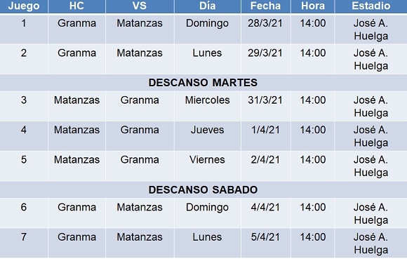 El duelo es al mejor de siete partidos, con hora de inicio siempre a las 2:00 de la tarde. En caso de extenderse a siete desafíos la fecha tope (si no se suspende por lluvia ningún juego) sería el 5 de abril.