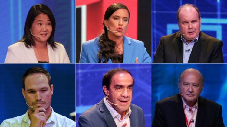 Los siete candidatos con mayores opciones de pasar al balotaje son el ex legislador Yonhy Lescano (Acción Popular), la antropóloga Verónika Mendoza (Frente Amplio), el economista Hernando de Soto (Avanza País), la hija del expresidente Alberto Fujimori, Keiko Fujimori (Fuerza Popular), el exfutbolista George Forsyth (Victoria Nacional), el maestro y sindicalista Pedro Castillo, (Perú Libre) y el empresario Rafael López Aliaga (Renovación Popular).
