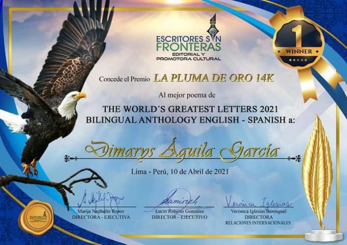 Así expresa una nota remitida por la destacada escritora, periodista y editora cubana Dimarys Águila García (Güira de Melena, La Habana, hoy Artemisa, 1979), al prestigioso grupo peruano Escritores sin Fronteras, luego de que este le informara que había sido acreedora del Premio Único La Pluma de Oro 14K, por su poema Amnios, con el cual participó en el certamen internacional The World´s Greatest Letters 2021, Bilingual Anthology English-Spanish (Las Mejores Letras del Mundo 2021, Antología Bilingüe Inglés-Español).