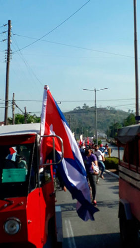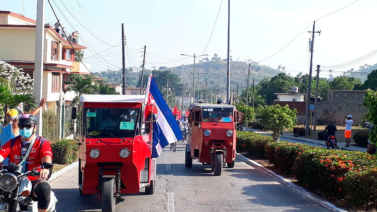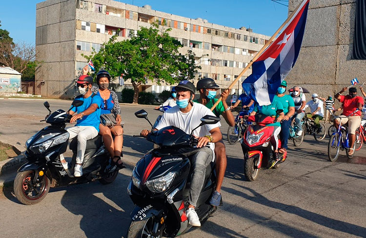 Por la calle Colón enfiló la caravana, llegó hasta el Parque Leoncio Vidal y de ahí a la Plaza, en el trayecto se sumaban participantes, el pueblo desde aceras y ventanas apoyaba la convocatoria, enarbolaba banderas cubanas en símbolo de soberanía y lealtad.