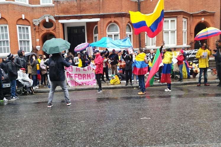 Al respecto, señaló que la víspera, día en que comenzó el paro nacional en Colombia contra la reforma tributaria anunciada por el presidente Iván Duque, un grupo de sus compatriotas se congregó frente a la embajada del país suramericano en Londres para apoyar las demandas de los trabajadores.