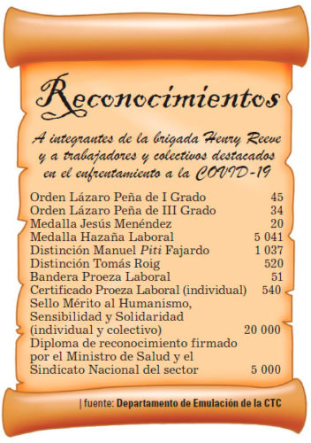 En el año 2020 realizamos una extensa jornada de homenaje a los trabajadores de la salud en la que se entregaron numerosos reconocimientos dentro de los cuales resalta por su novedad el Sello Mérito al Humanismo, Sensibilidad y Solidaridad, añadido al sistema de condecoraciones de la CTC y de los Sindicatos Nacionales de Trabajadores de la Salud y Civiles de la Defensa, a otorgarse por única vez a colectivos y trabajadores destacados. Entre el pasado año y lo que va de 2021 cinco sobresalientes profesionales de la salud, incluidos científicos, fueron merecedores del Título Honorífico de Héroe y Heroína del Trabajo de la República de Cuba. Estamos muy orgullosos de la actuación de los hombres y las mujeres del sector. Para su protección, por ser los más expuestos al virus y como reconocimiento a su labor, han sido los primeros en ser inmunizados.