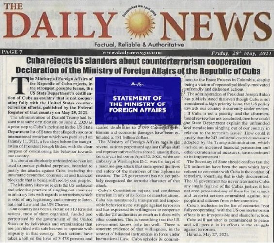 En su edición impresa y a media página, el referido cotidiano de esta nación del occidente africano reproduce el texto de la Cancillería cubana, en el cual se rechaza en los términos más categóricos la certificación que hizo recientemente el Departamento de Estado de EE.UU. de que la isla caribeña “no coopera plenamente con los esfuerzos antiterroristas” del actual régimen de la Casa Blanca.