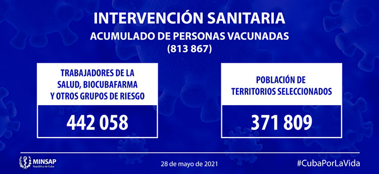 Al cierre del 28 de mayo se acumulan 813 mil 867 personas vacunadas, de ellos 442 mil 058 como parte de los trabajadores de la salud, BioCubaFarma y otros grupos de riesgo; y 371 mil 809 como parte de la población de los territorios seleccionados.