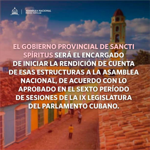 En su Sexto Periodo Ordinario de Sesiones de la IX Legislatura, la Asamblea Nacional aprobó conocer y evaluar en su próxima sesión el informe de rendición de cuenta del Gobierno Provincial del Poder Popular de Sancti Spíritus, en correspondencia con el Artículo 108 de la Constitución de la República de Cuba y con lo estipulado en la Ley no. 131 «Ley de Organización y Funcionamiento de la Asamblea Nacional del Poder Popular y del Consejo de Estado».