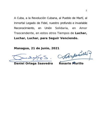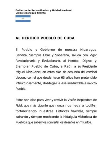 El Pueblo y Gobierno de nuestra Nicaragua Bendita, Siempre Libre y Soberana, saluda con Vigor Revolucionario y Evolucionario, al Heroico, Digno y Ejemplar Pueblo de Cuba, a Raúl, a su Presidente Miguel Díaz-Canel, en estos días de denuncia del criminal bloqueo con el que desde hace 63 años han pretendido infructuosamente, doblegar a ese irreductible e invicto Pueblo.