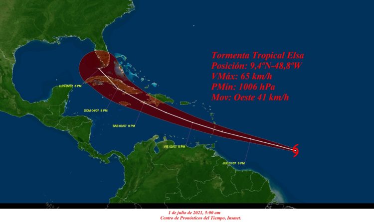 La depresión tropical número cinco continuó organizándose e intensificándose durante la noche y madrugada, toda vez que mantiene abundantes nublados con numerosa actividad de chubascos, lluvias y tormentas eléctricas. Ahora los vientos máximos sostenidos se han incrementado hasta los 65 kilómetros por hora, con rachas superiores, y la presión central es de 1006 hectoPascal, por lo que se ha convertido en la tormenta tropical Elsa, la quinta de la actual temporada ciclónica.