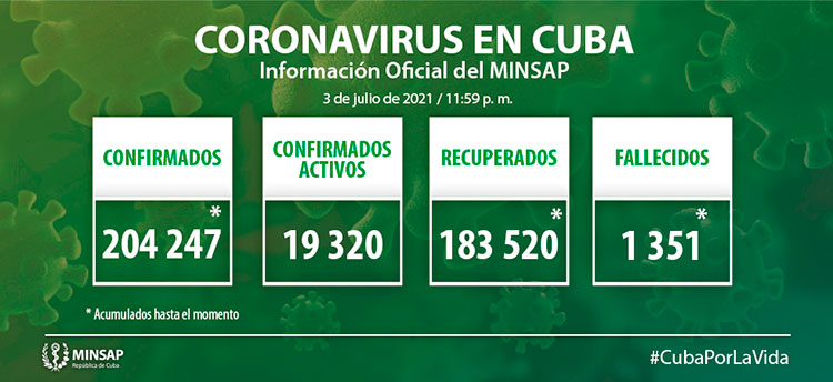 Hasta el 3 de julio se reportan 190 países y 30 territorios con casos de COVID-19, asciende a 184 millones 47 mil 635 los casos confirmados (+ 367 mil 896) con 11 millones 627 mil 581 casos activos y 3 millones 983 mil 364 fallecidos (+ 7 mil 828) para una letalidad de 2,16 (=).