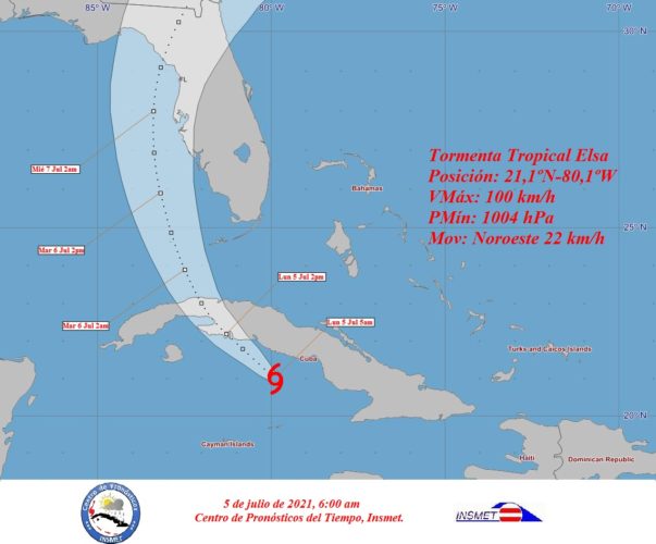 A las seis de la mañana el centro de la tormenta tropical Elsa, fue estimado en los 21.1 grados de latitud Norte y los 80.1 grados de longitud Oeste, a unos 145 kilómetros, al sudeste de Playa Girón, provincia de Matanzas.