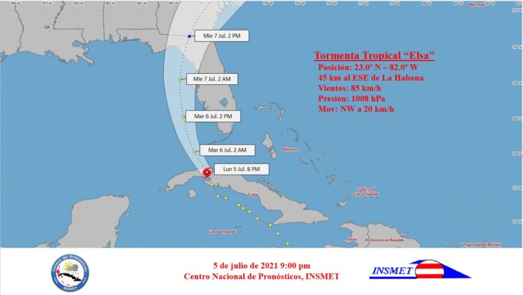 A las nueve de la noche de hoy la región central de la tormenta tropical Elsa, fue estimada en los 23.0 grados de latitud Norte y los 82.0 grados de longitud Oeste, a unos 40 kilómetros al estesudeste de La Habana. Sus vientos máximos sostenidos son de 85 kilómetros por hora, con rachas superiores y su presión central es de 1008 hPa.
