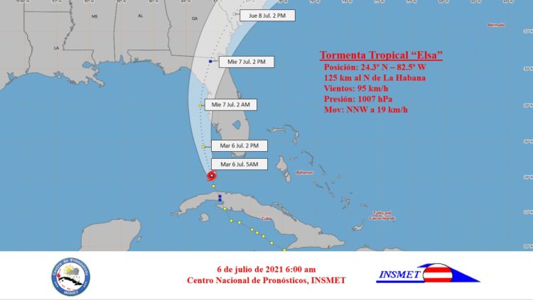 Durante la madrugada de hoy la tormenta tropical Elsa continuó su desplazamiento al nortenoroeste sobre el estrecho de la Florida, a unos 19 kilómetros por hora. Sus áreas de nublados, con chubascos y lluvias fuertes se mantienen afectando a Matanzas, Mayabeque y el municipio especial Isla de la Juventud.