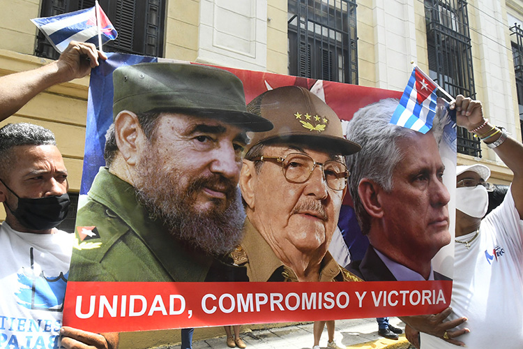 ¡Cuba va!, y ¡La calle es de los revolucionarios!, fueron algunas de las consignas coreadas por los participantes en el acto quienes portaban banderas cubanas e imágenes del líder cubano Fidel Castro, del General de Ejército Raúl Castro y del Presidente cubano Miguel Díaz-Canel Bermúdez.