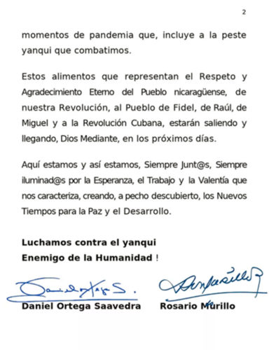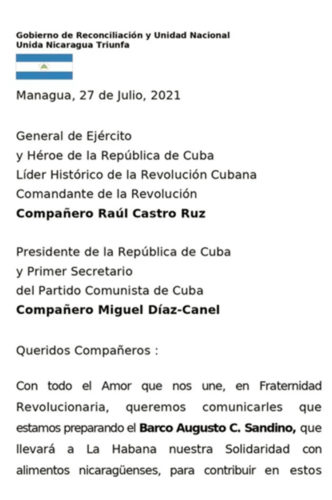 En una carta enviada al General de Ejército Raúl Castro y al Primer Secretario del Comité Central del Partido Comunista de Cuba y Presidente de la República, Miguel Díaz-Canel Bermúdez, el Presidente Daniel Ortega y la Vicepresidenta Rosario Murillo, precisaron que la embarcación traerá a La Habana su solidaridad, expresada en alimentos nicaragüenses, una contribución «en estos momentos de pandemia que, incluye a la peste yanqui que combatimos».