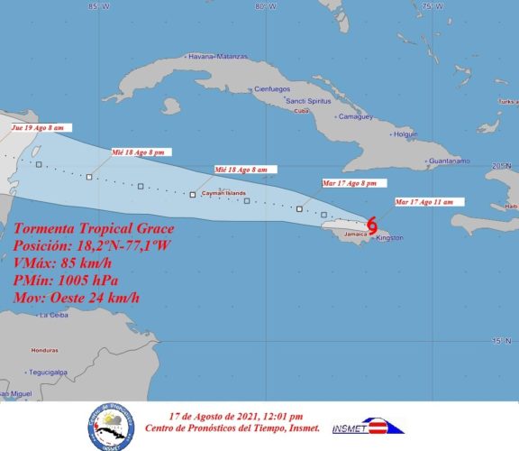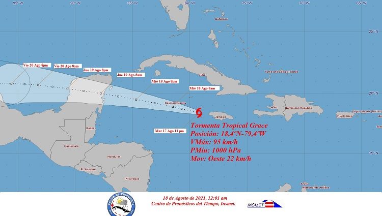 Durante la noche le región central de la tormenta tropical Grace comenzó a alejarse de Jamaica y se desplaza hacia el mar Caribe occidental, con rumbo oeste, ahora a 22 kilómetros por hora, aunque las áreas de nublados y lluvias se mantienen sobre gran parte del mar Caribe central, Jamaica y la región oriental de Cuba. Este organismo mantiene sus vientos máximos sostenidos de 95 kilómetros por hora, con rachas superiores y la presión mínima disminuyó a 1000 hectoPascal.