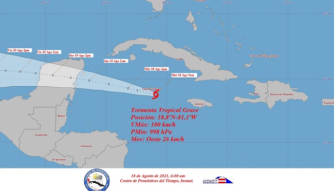 A la medianoche de hoy, el centro de Grace se estimó en los 18.4 grados de latitud Norte y los 79.4 grados de longitud Oeste, posición que lo sitúa a 230 kilómetros al este sudeste de Caimán Grande, en el mar Caribe occidental y a 295 kilómetros al sur suroeste de Santa Cruz del Sur, Camagüey.