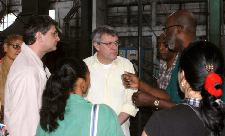 Recorrido de sindicalistas Italianos de la Federación de empleados y obreros Metalúrgicos FIOM. De la confederación general de trabajadores Italianos en la Empresa planta de Herrajes de Guanabacoa. La Habana 19 de febrero 2016. Al centro Landini Mauricio. Foto Heriberto González Brito