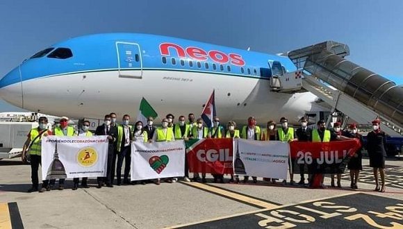 La operación solidaria convocada por la CGIL contó con el papel activo de la Embajada de Cuba en Italia, reconoció Bassoli, pues la representación diplomática facilitó la conexión y gestión ante autoridades cubanas competentes y la coordinación con otras campañas de solidaridad promovidas por organizaciones de la sociedad civil italiana. La convergencia de muchos actores permitió llegar a un acuerdo con la compañía aérea NEOS y coordinamos un vuelo especial, totalmente lleno con los materiales recolectados y comprados.