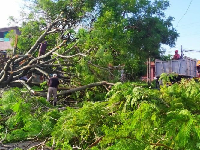 La caída de los árboles afectó las redes eléctricas y telefónicas, de ahí el esfuerzo para recoger y después restablecer ambos servicios. (Foto tomadas del perfil en Facebook de José René Morales Núñez)