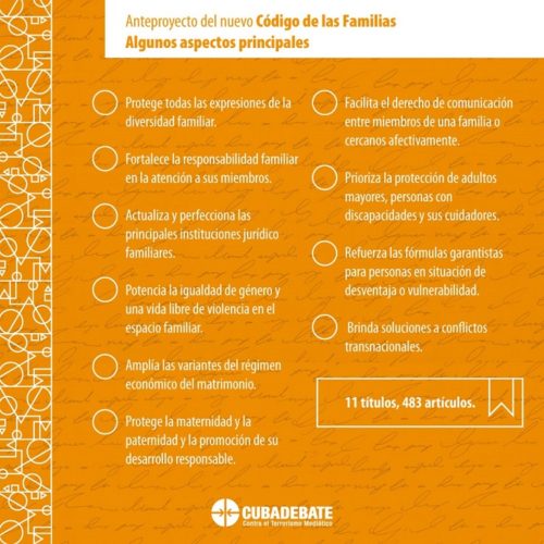 La versión 22 del anteproyecto del Código de las Familias fue publicada este miércoles. El texto, coherente con la Constitución de la República, desarrolla las diversas instituciones jurídico-familiares en correspondencia con el carácter humanista del proceso revolucionario, los resultados de la ciencia del Derecho de Familia, de la práctica judicial en Cuba y los avances en la legislación de otros países.
