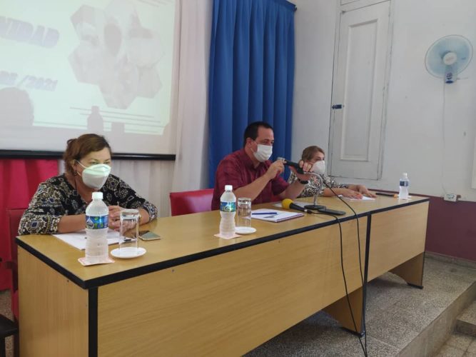 Yilianni Yera Marín, presidenta de la Federación Estudiantil Universitaria en Ciencias Médicas, al intervenir en la reunión, informó sobre la participación del alumnado en la lucha contra la COVID-19, que se inició hace más de un año con las pesquisas activas a nivel comunitario para detectar personas enfermas o sospechosas de tener ese mal que le ha dado la vuelta al mundo.