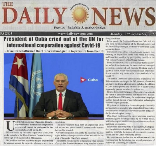 Los llamados del presidente cubano, Miguel Díaz-Canel, en la ONU a la cooperación internacional para enfrentar la pandemia de la Covid-19,y poner fin al bloqueo de EE.UU. contra su país, son destacados hoy por el diario gambiano Daily News.