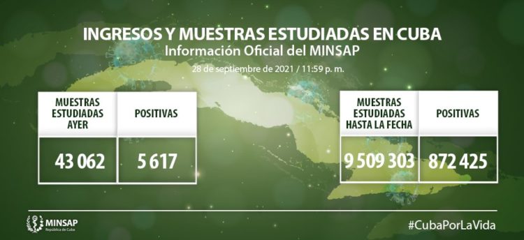 Para la COVID-19 se realizaron un total de 43 mil 062 muestras para la vigilancia en el día, resultando 5 mil 617 positivas. El país acumula El país acumula 9 millones 509 mil 303 muestras realizadas y 872 mil 425 positivas.