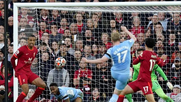Ausente por lesión el lateral Trent Alexander-Arnold, el City llevó mucho peligro por esa banda izquierda de su ataque con la conexión Cancelo-De Bruyne-Foden y así llegó su segunda ocasión clara con un centro del inglés que remató el belga con un cabezazo que salió ligeramente alto (34′).