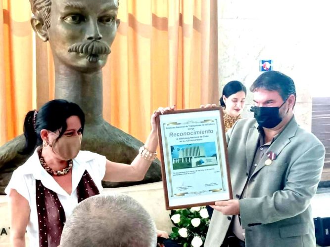 El reconocimiento fue recibido de manos de la dirigente sindical por el director de la biblioteca, Omar Valiño Cedré, prestigioso crítico teatral, ensayista, profesor y editor cubano, quien agradeció a la CTC por este significativo reconocimiento que la BNJM acoge justamente en el Día de la Cultura Nacional.