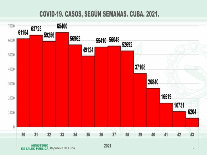 Portal Miranda aseguró que la confirmación de 6 204 pacientes positivos a la COVID-19 en la semana 43 del año, ratifica el decrecimiento de los contagios por seis semanas consecutivas, lo cual significa que en el país enfermaron 4 534 personas menos que en igual periodo anterior.