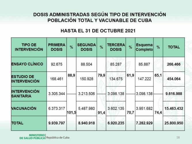 El ministro cubano agregó que la disminución en la intensidad de la transmisión de la enfermedad que se constata en octubre, respecto al mes de septiembre, es una realidad que nos llena de optimismo y que más de 7 millones 282 mil cubanos habían completado ya su esquema de vacunación el pasado domingo.
