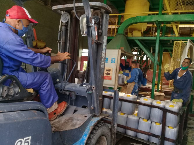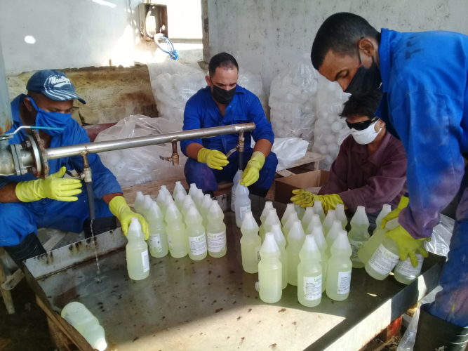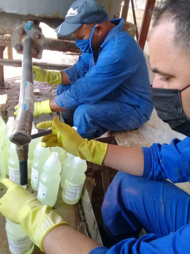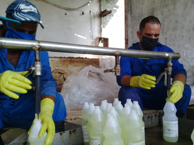 Un cuarteto integrado por Volodia Álvarez, Jorge Cambras, Alain Requejo y Juan Carlos Vázquez embaza Lejía al uno por ciento, tan indispensable en tiempos de COVID-19, sin embargo, reconocen que ese penetrante olor, ya casi imperceptible por ellos, puede afectarles. Los guantes usados no tienen la calidad necesaria y los nasobucos cada quien los trae elaboradas de forma casera, explican.
