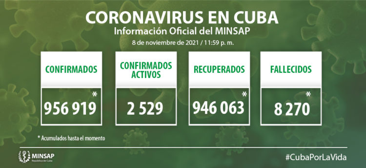De los 956 mil 919 pacientes diagnosticados con la enfermedad, se mantienen ingresados 2 mil 529, de ellos 2 mil 461 con evolución clínica estable. Se acumulan 8 270 fallecidos (5 en el día), letalidad de 0,87% vs 2,02% en el mundo y 2,44% en Las Américas; dos evacuados, 55 retornados a sus países, en el día hubo 619 altas, se acumulan 946 mil 063 pacientes recuperados (98,9%). Se atienden en las terapias intensivas 68 pacientes confirmados de ellos 18 críticos y 50 graves.