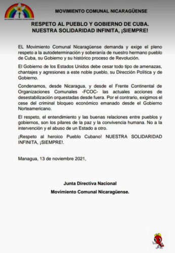 Esta supuesta “marcha pacífica” no es otra cosa que un componente más de un plan subversivo intervencionista extranjero, por lo que expresamos nuestro profundo rechazo a esta nueva acción agresiva del gobierno de los Estados Unidos a Cuba y nos solidarizamos con el pueblo cubano que defiende su Revolución y el legítimo derecho a la autodeterminación de los pueblos.