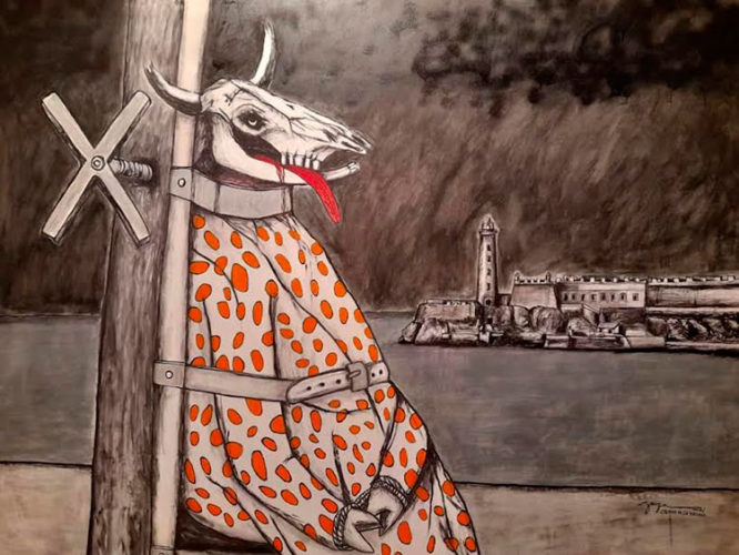 Pero la constante es la res: el toro, la vaca, el buey… Se sabe que en Cuba este animal se mueve en más de un ámbito de significación. Ha devenido icono popular. De eso se aprovecha Zarza.