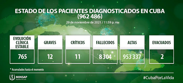 De los 962 mil 486 pacientes diagnosticados con la enfermedad, se mantienen ingresados 788, de ellos 765 con evolución clínica estable. Se acumulan 8 304 fallecidos (4 en el día), letalidad de 0,86% vs 1,99% en el mundo y 2,43% en Las Américas; dos evacuados, 55 retornados a sus países, en el día hubo 207 altas, se acumulan 953 mil 337 pacientes recuperados (99,0%). Se atienden en las terapias intensivas 23 pacientes confirmados de ellos 11 críticos y 12 graves.