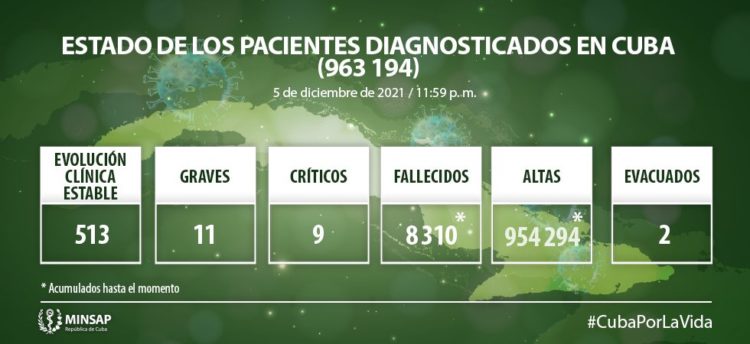 De los 963 mil 194 pacientes diagnosticados con la enfermedad, se mantienen ingresados 533, de ellos 513 con evolución clínica estable. Se acumulan ocho mil 310 fallecidos (uno en el día), letalidad de 0,86 % vs 1,98 % en el mundo y 2,41 % en las Américas; dos evacuados, 55 retornados a sus países, en el día hubo 119 altas, se acumulan 954 mil 294 pacientes recuperados (99,1%). Se atienden en las terapias intensivas 20 pacientes confirmados de ellos nueve críticos y 11 graves.
