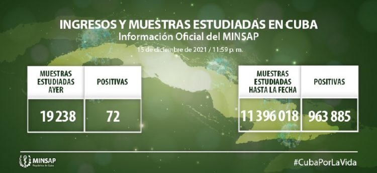 Para la COVID-19 se realizaron un total de 19 mil 238 muestras para la vigilancia en el día, resultando positivas 72. El país acumula 11 millones 396 mil 018muestras realizadas y 963 mil 885 positivas.