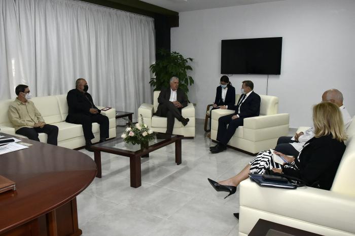 En el encuentro estuvieron presentes, además, el primer ministro Manuel Marrero Cruz, el vice primer ministro Ricardo Cabrisas Ruiz, el canciller Bruno Rodríguez Parrilla, y la ministra interina de Comercio Exterior y de Inversión Extranjera, Ana Teresita González Fraga.