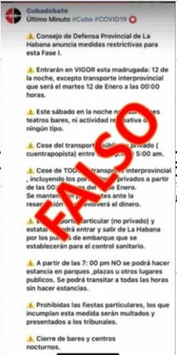 «Circula en las redes sociales información falsa sobre supuestas medidas restrictivas para La Habana. Las decisiones adoptadas por las autoridades de la Capital serán debidamente divulgadas por los canales oficiales», señala el tuit.