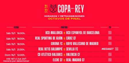 Hoy se conocieron los pareos para los octavos de final de la Copa del Rey y destacan los choques Athletic de Bilbao-Barcelona, Elche-Real Madrid, Betis-Sevilla y Atlético de Madrid-Real Sociedad.