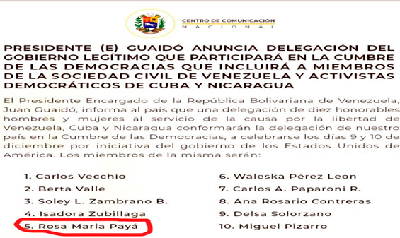 Payá fue invitada a asistir a la Cumbre de la Democracia como parte de la delegación venezolana. Como podemos ver en la imaginaria “papelería gubernamental” de Guaidó presentada a continuación, Payá fue designada como uno de los “10 honorables hombres y mujeres que luchan por la libertad en Venezuela, Cuba y Nicaragua.”