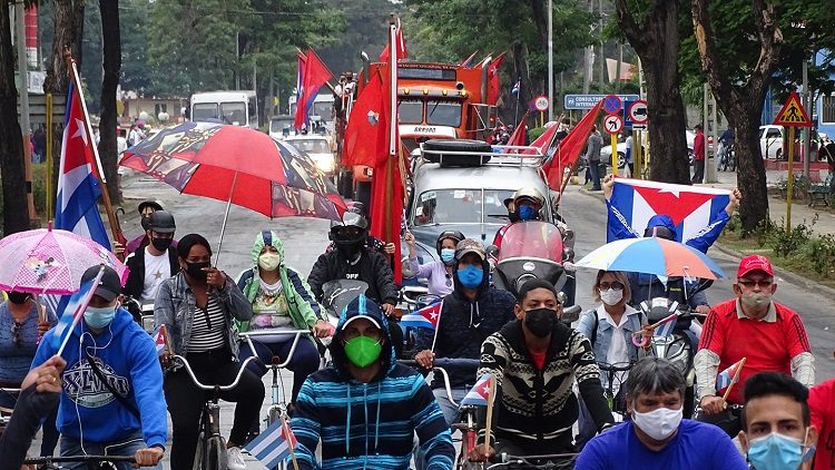 La caravana, compuesta por bicicletas, motos y motorinas eléctricas, camiones y autos, recorrió las principales arterias de la ciudad con banderas cubanas y carteles que pedían el cese de esa inhumana y cruel política contraria al derecho internacional y a los principios de soberanía y autodeterminación de los pueblos.