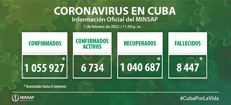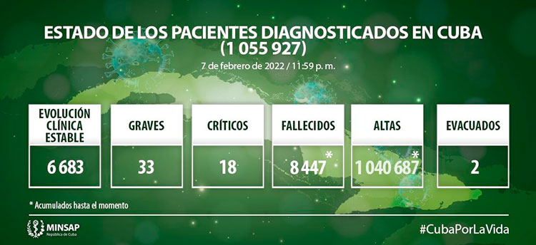 Del millón 055 mil 927 de pacientes diagnosticados con la enfermedad, se mantienen ingresados 6 mil 734, de ellos 6 mil 683 con evolución clínica estable. Se acumulan 8 mil 447 fallecidos (4 en el día), letalidad de 0,80% vs 1,46% en el mundo y 1,81% en Las Américas; dos evacuados y 57 retornados a sus países. En el día hubo 1 mil 548 altas (530 más que los diagnosticados), se acumulan 1 millón 040 mil 687 pacientes recuperados (98,6%). Se atienden en las terapias intensivas 51 pacientes confirmados de ellos 18 críticos y 33 graves.