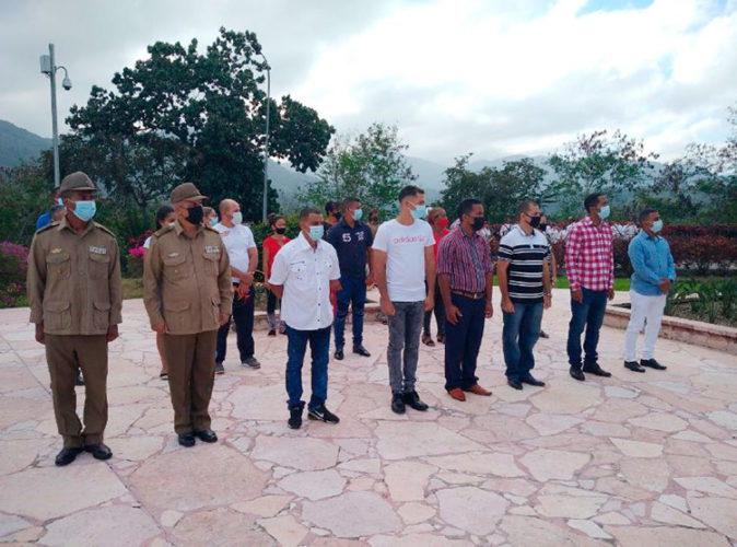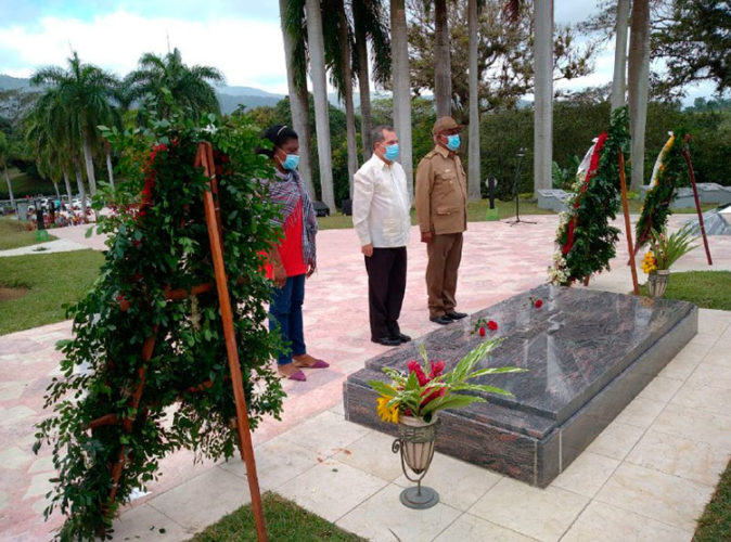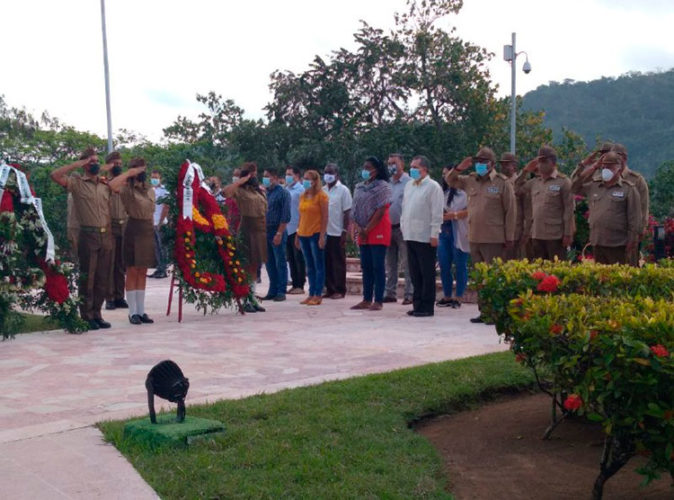 José Ramón Monteagudo y Beatriz Johnson, primer secretario del PCC y gobernadora en el territorio, respectivamente, y el General de Brigada Luis Lores, jefe de la Región Militar Santiago, encabezaron la conmemoración junto a las autoridades del municipio montañoso.